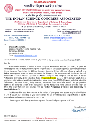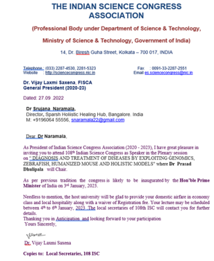 Invitation from the President of Indian Science Congress, 2024