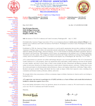 Invitation from Organizers of American Telugu Association, 17th Convention, Washington D.C., 2023