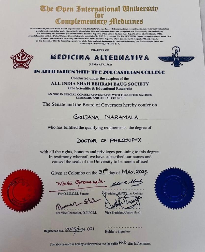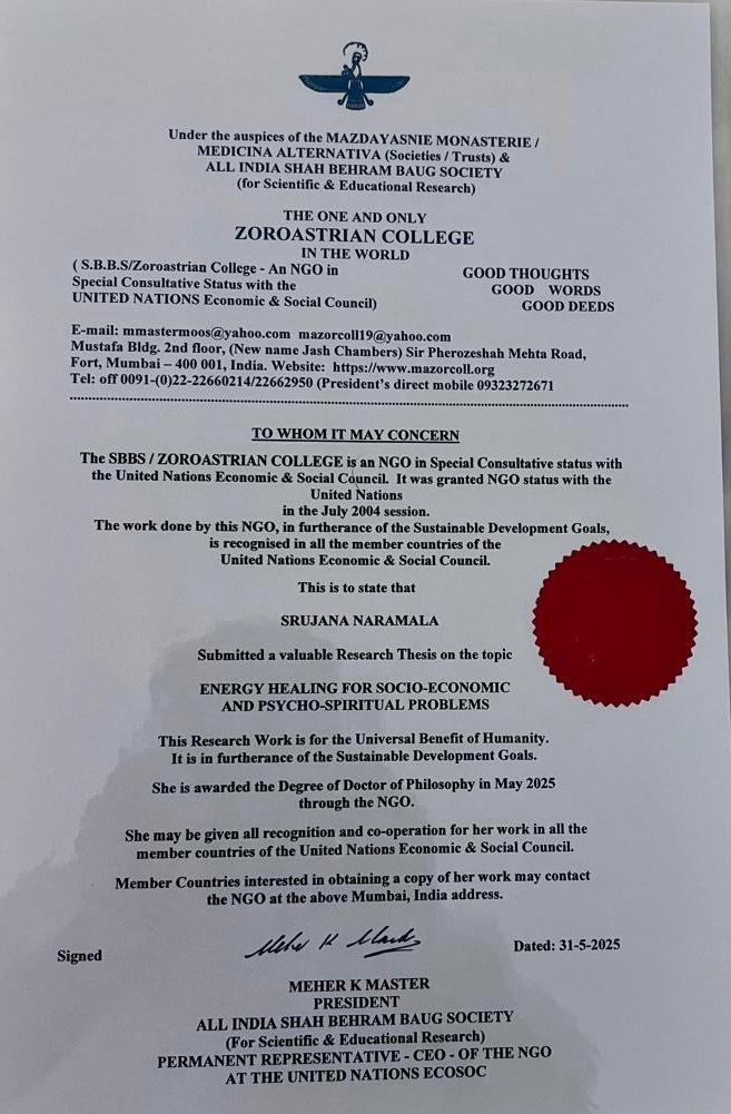 Dr. Srujana Naramala is a renowned holistic healer and spiritual guide with a rich background in both scientific and metaphysical disciplines. She holds a postgraduate degree in Anthropology and has recently been awarded a Doctorate (Ph.D.) from Zoroastrian College (Special Consultative Status with the UN Economic & Social Council) for her groundbreaking research on “Energy Healing for Socio-Economic and Psycho-SpiritualProblems. Currently expanding her expertise through the study of Astrology, Dr. Srujana continues to integrate diverse healing sciences into her practice.